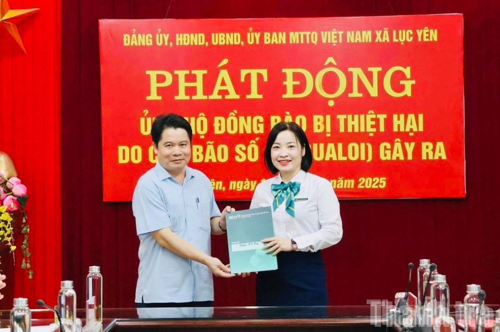 Ông Lý Đạt Lam, Chủ tịch MTTQ xã Lục Yên, đại diện tiếp nhận phần quà 132 triệu đồng ủng hộ đồng bào bị ảnh hưởng bởi bão lũ từ các tổ chức, cá nhân hảo tâm. Ảnh: Bình Yên