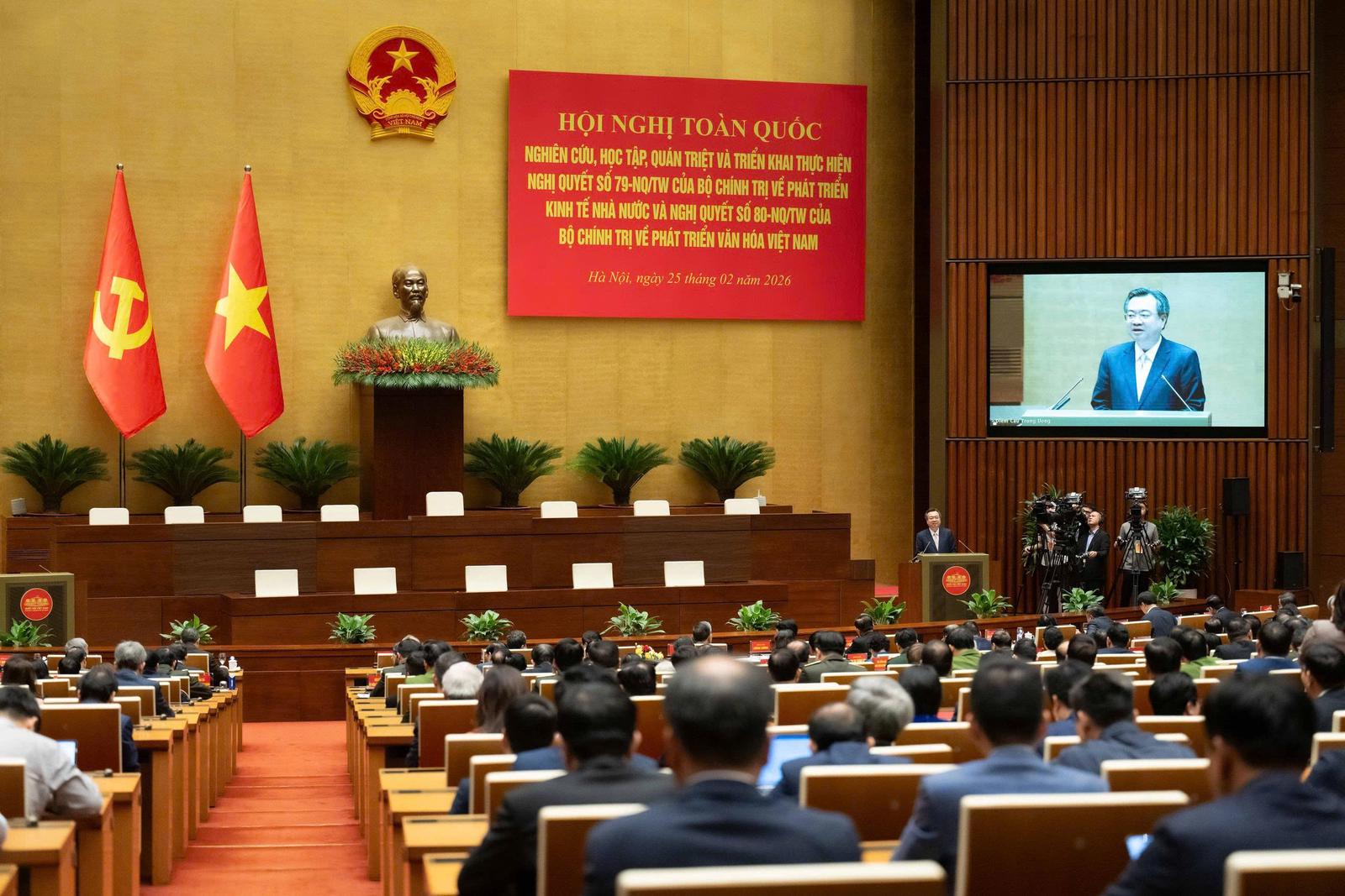 Các đại biểu tham dự Hội nghị toàn quốc nghiên cứu, học tập, quán triệt và triển khai thực hiện Nghị quyết 79 về phát triển kinh tế Nhà nước và Nghị quyết 80 về phát triển văn hóa Việt Nam của Bộ Chính trị. Ảnh: P.Thắng