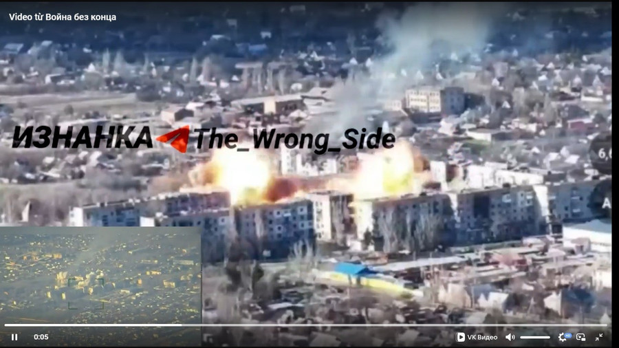 Đoạn video cho thấy ba quả bom dẫn đường FAB-500 mang hệ thống điều chỉnh mục tiêu UMPK đồng loạt được ném xuống một khu dân cư toàn nhà cao tầng ở Huliaipole, phá hủy các vị trí hỏa lực của Quân đội Ukraine.