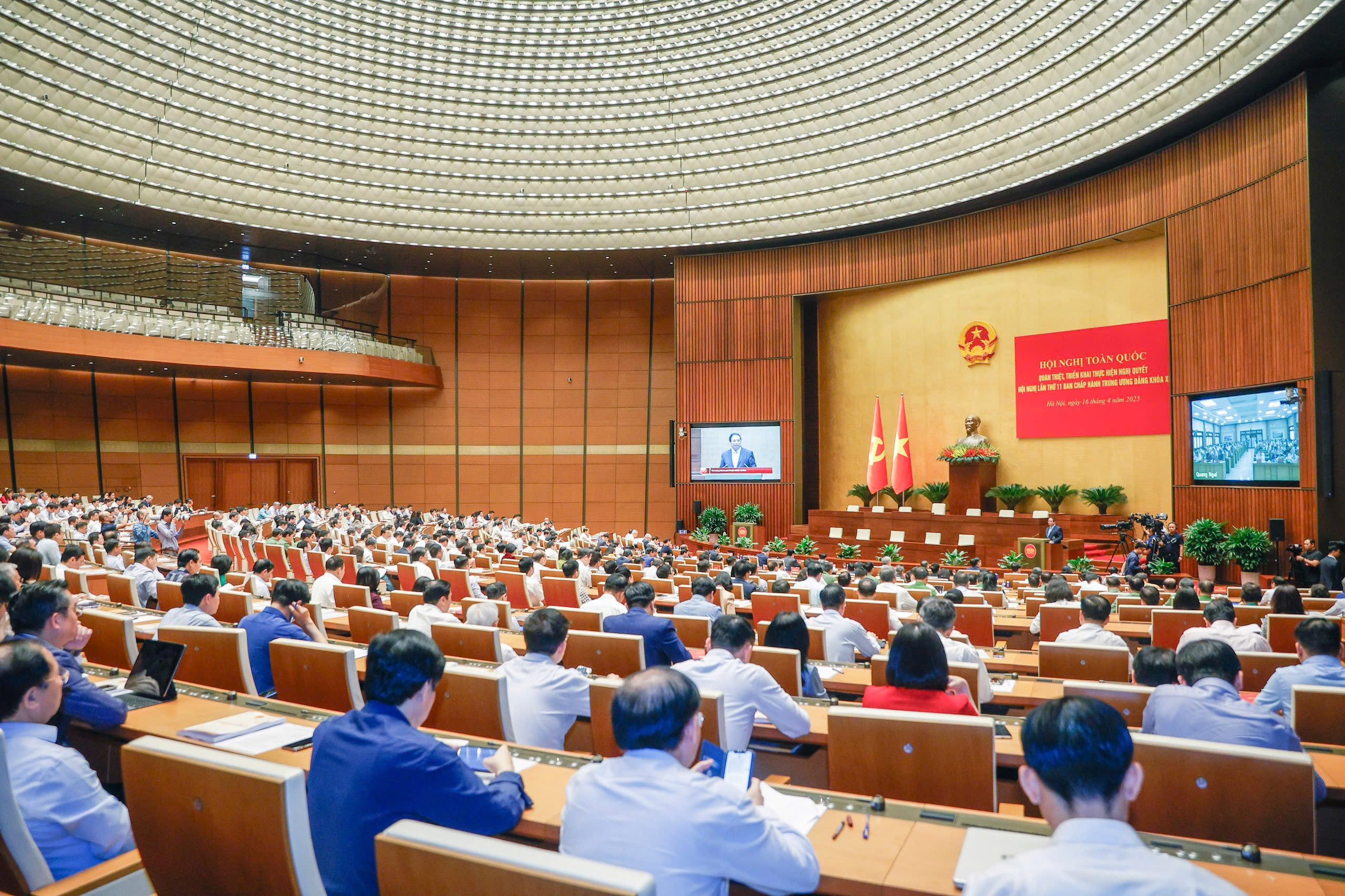 Mở đầu hội nghị, Thủ tướng Phạm Minh Chính trình bày chuyên đề “Về các dự thảo Văn kiện trình Đại hội XIV của Đảng: Những điểm mới trong Tổng kết một số vấn đề lý luận và thực tiễn về công cuộc đổi mới theo định hướng xã hội chủ nghĩa trong 40 năm qua ở Việt Nam; Những điểm mới trong dự thảo Báo cáo tổng kết công tác xây dựng Đảng và thi hành Điều lệ Đảng trình Đại hội XIV của Đảng; Những điểm mới trong dự thảo Báo cáo chính trị trình Đại hội XIV của Đảng; Những điểm mới trong dự thảo báo cáo 5 năm thực hiện chiến lược phát triển kinh tế, xã hội 10 năm 2021-2030; phương hướng, nhiệm vụ phát triển kinh tế, xã hội 5 năm 2026-2030”.
