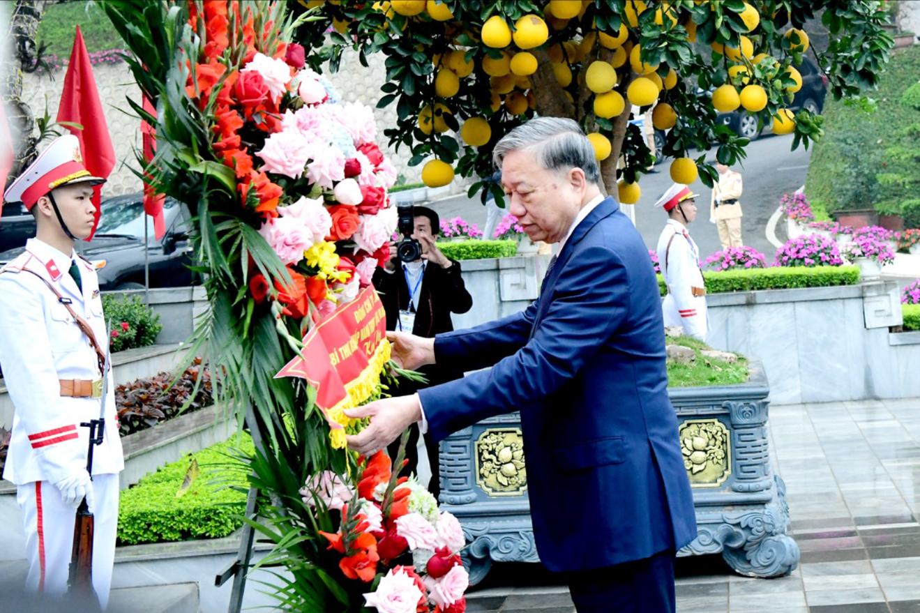 Tổng Bí thư Tô Lâm dâng hoa tưởng nhớ trước Tượng đài Chủ tịch Hồ Chí Minh tại Hà Giang