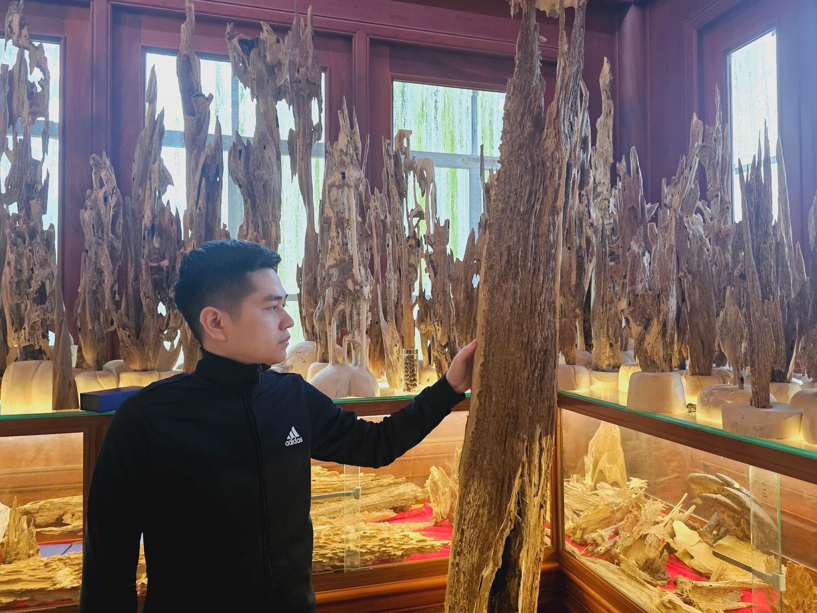 Chủ cơ sở chế tác Nguyễn Trọng Ngọc Quang bên những sản phẩm trầm tốc bông nguyên bản. Ảnh: NT