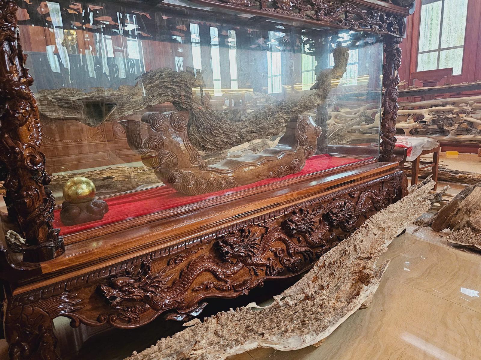 Tại đây xuất hiện khối trầm tốc bông vô cùng độc đáo, được nghệ nhân chế tác từ thân cây dó trầm đúng nguyên bản, không keo dán, không lắp ghép, mang dáng dấp hình tượng rồng. Người xưa hay có câu “nhất kỳ, nhì bông” là để nói về giá trị của loại trầm tốc bông này. Được đánh giá là sản phẩm có giá trị rất lớn về chất lượng, thẩm mỹ và kinh tế nên gia chủ đã đặt sản phẩm khối trầm tốc bông hình rồng này bảo quản trong tủ kính. Mặc dù được nhiều người trả giá cao nhưng gia chủ vẫn chưa đồng ý bán.