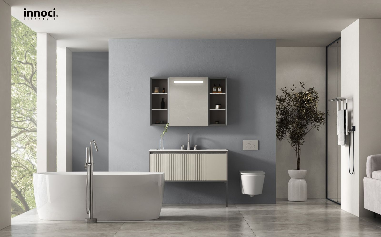 Phòng tắm chuẩn Âu mang phong cách thiết kế tối giản với các đường nét gọn gàng, bố cục thoáng và màu sắc trung tính của thương hiệu Innoci.